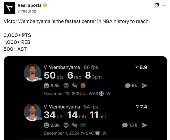 憑借這樣的表現(xiàn),文班亞馬僅花費133場比賽就拿到至少3000分1000籃板500助攻,成為NBA歷史上達(dá)成這一成就最快的中鋒球員。